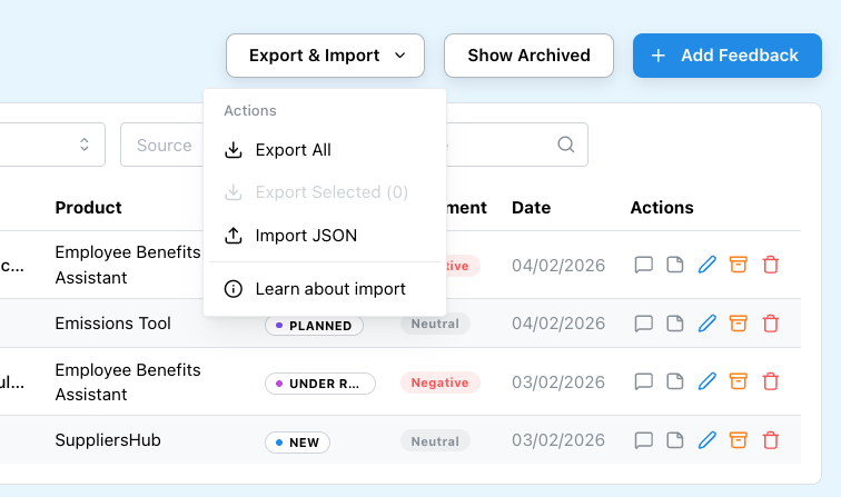 Export | Export almost all of the data to process it in other tools. Import feedback items to get a quick start from another capture tool. |