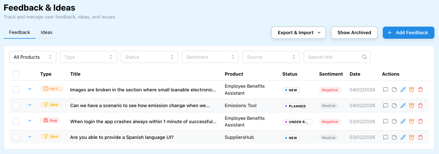Dashboard | Keep everything in view. Track incoming feedback, trends, and priority signals in a single, organized workspace. | |