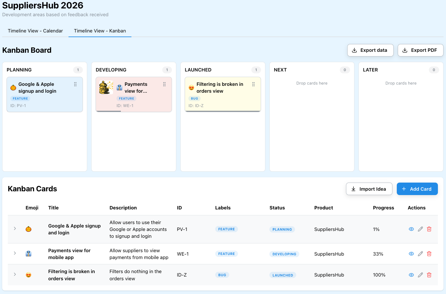 Interactive Roadmaps | Bring transparency to your product journey. Share public or private roadmaps that allow stakeholders to see what's planned, in progress, and shipped, reducing 'what's next' inquiries. | |