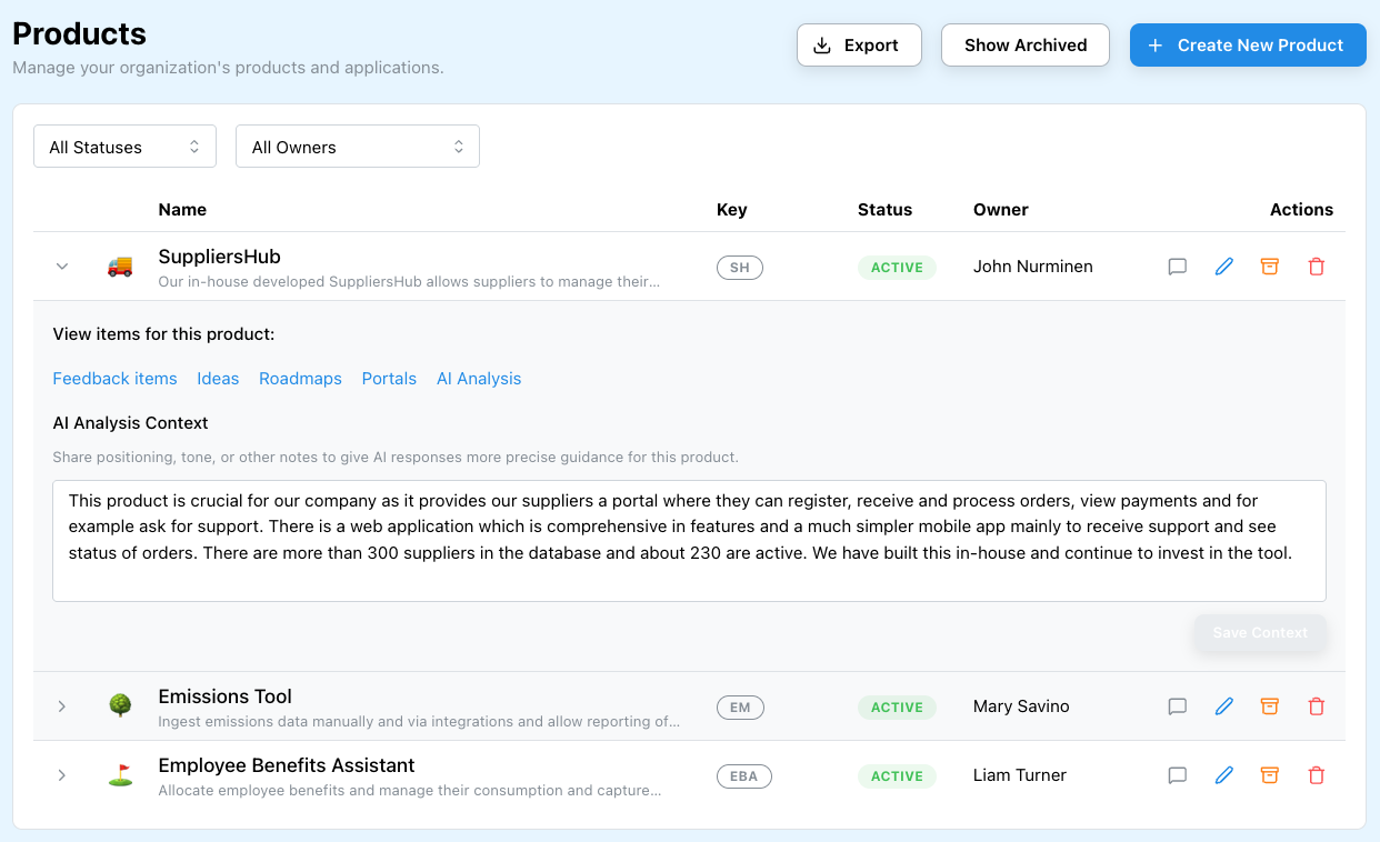 Product with AI context | Add your products to connect it all and provide AI context for AI analysis. | |